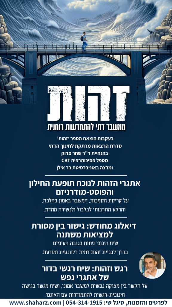 - דיאלוג מחודש: גישור בין מסורת למציאות משתנה – שיח חינוכי פתוח בגובה העיניים כדרך לבניית זהות דתית רלוונטית ומודעת.